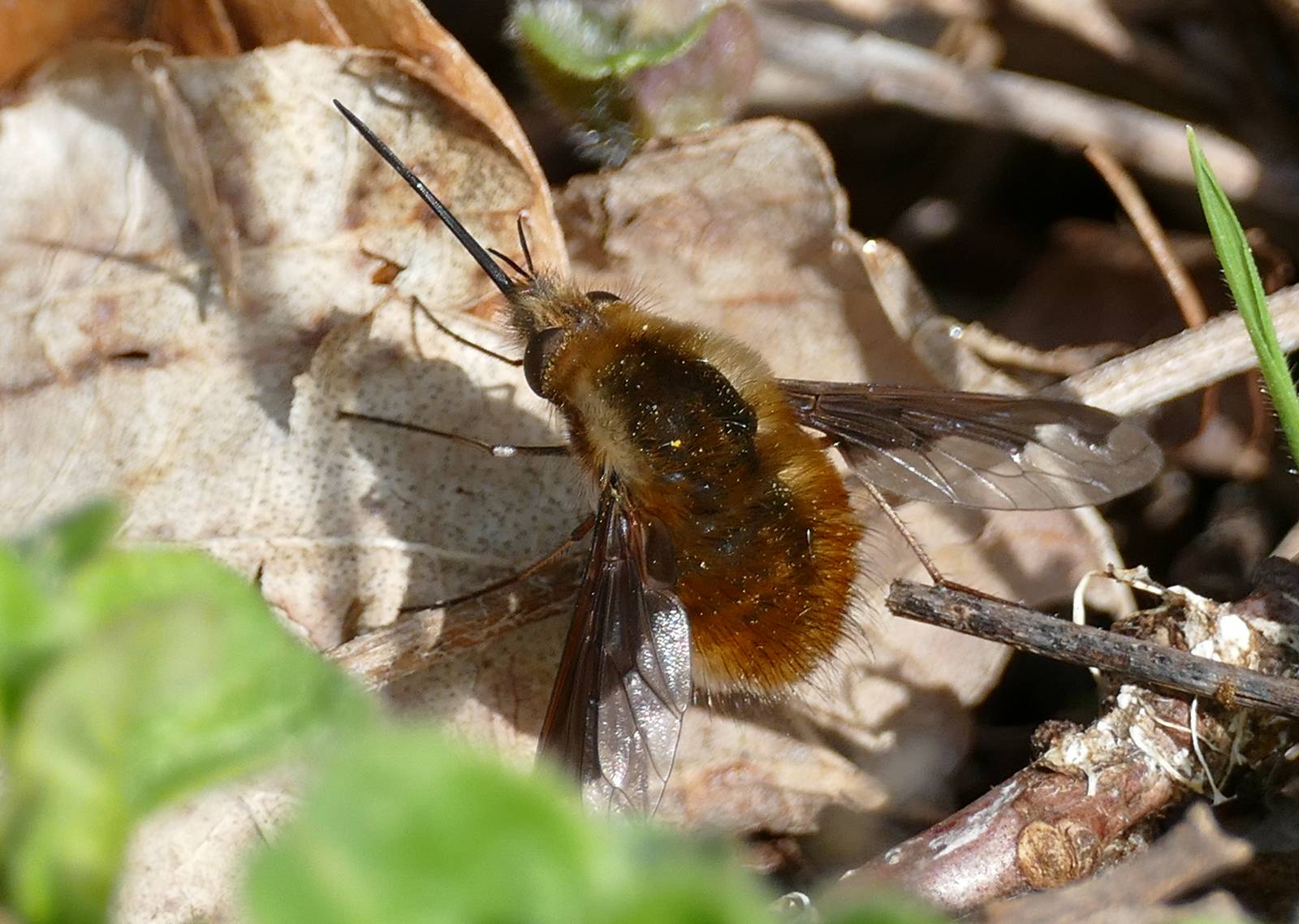 Auf dem Spaziergang haben wir mehrfach die kleinen Wollschweber gesehen. Ihr langer Rüssel