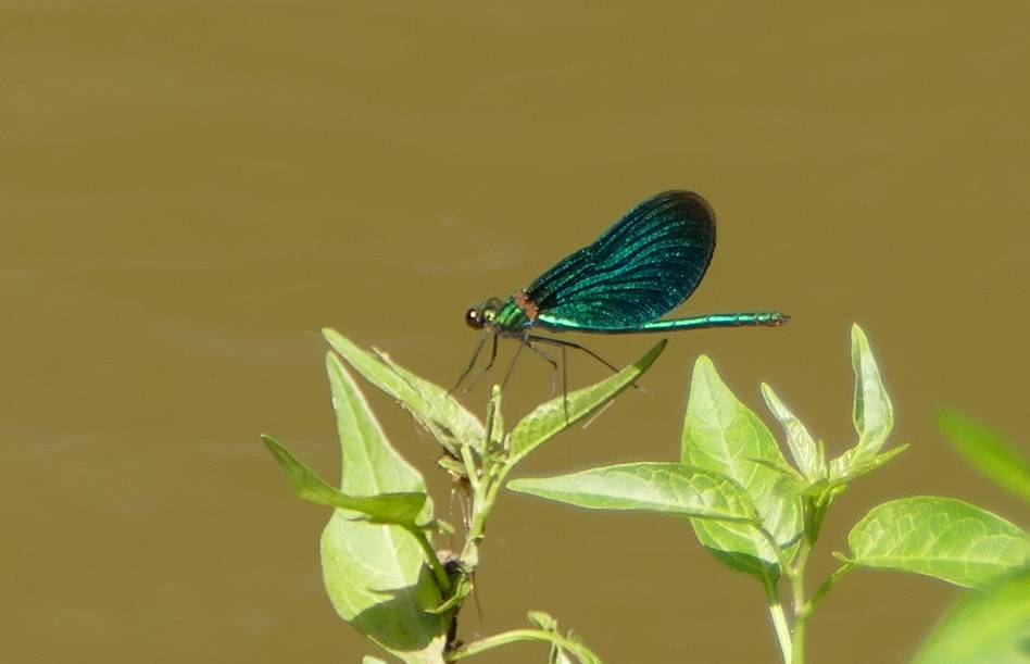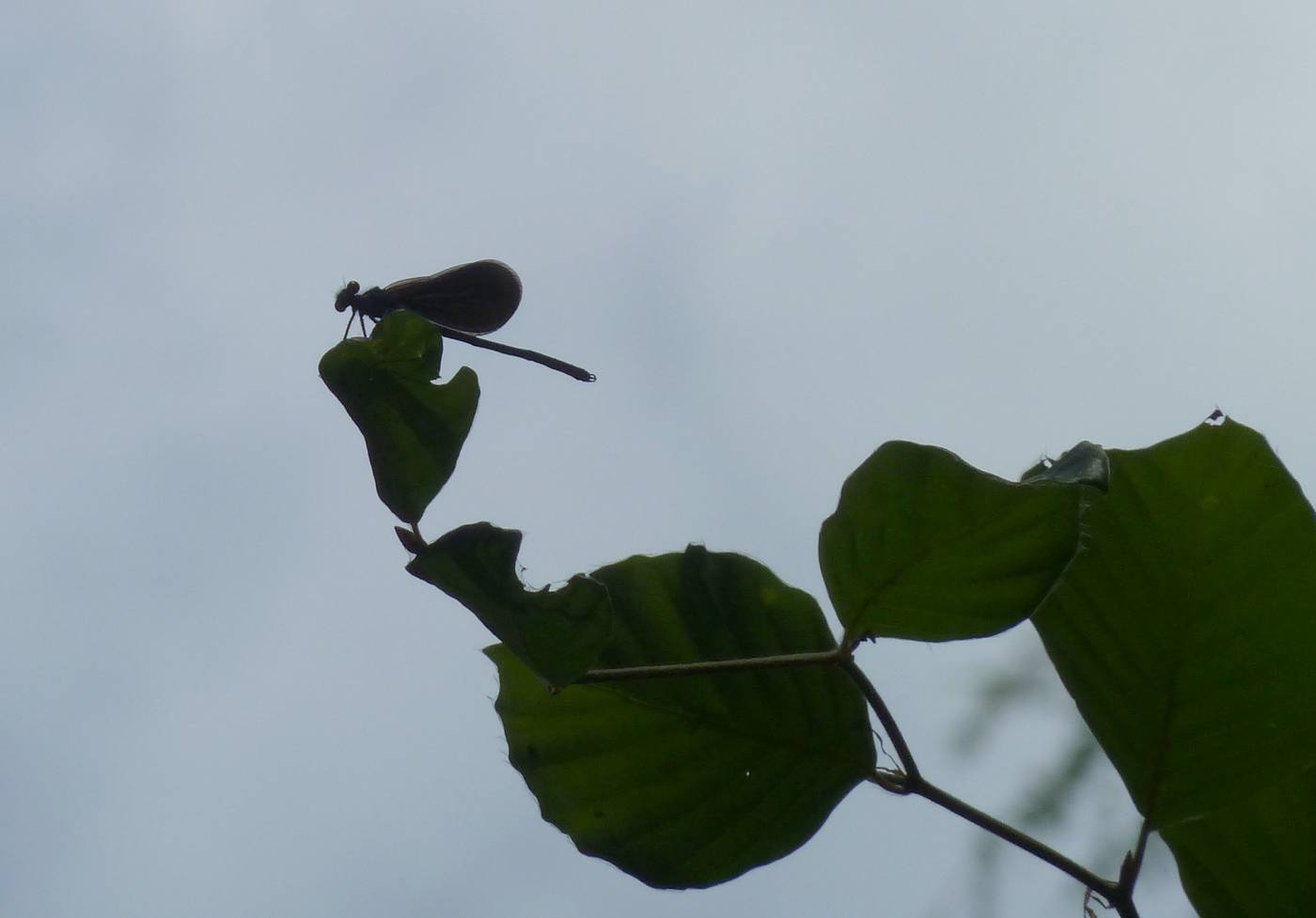 Blauflügel-Prachtlibelle. Vor Ort ist mir nur ein Silhouetten-Bild gelungen, daher habe ich noch ein weiteres Bild der Libelle von einem anderen Ausflug beigefügt.