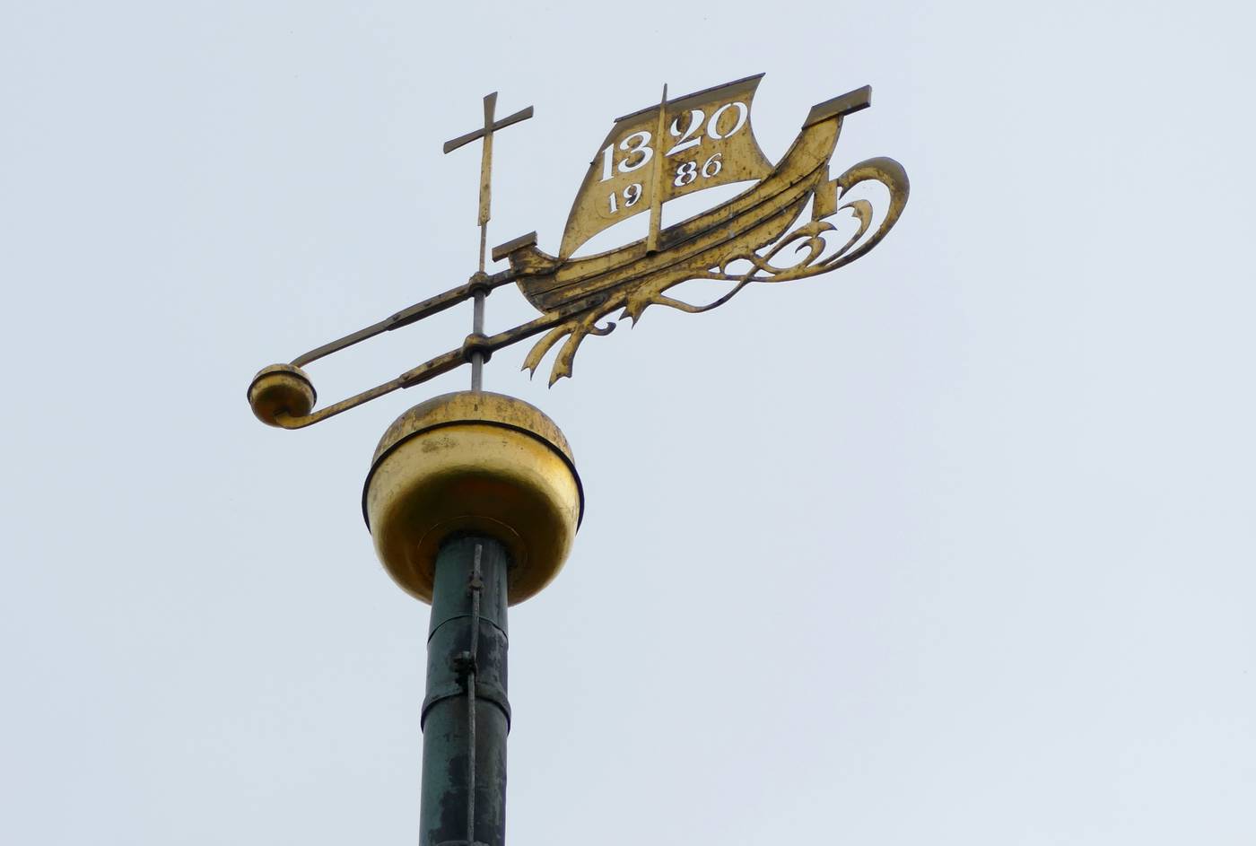 Die Wetterfahne auf der Kirche mit den beiden Jahreszahlen sieht hübsch aus.