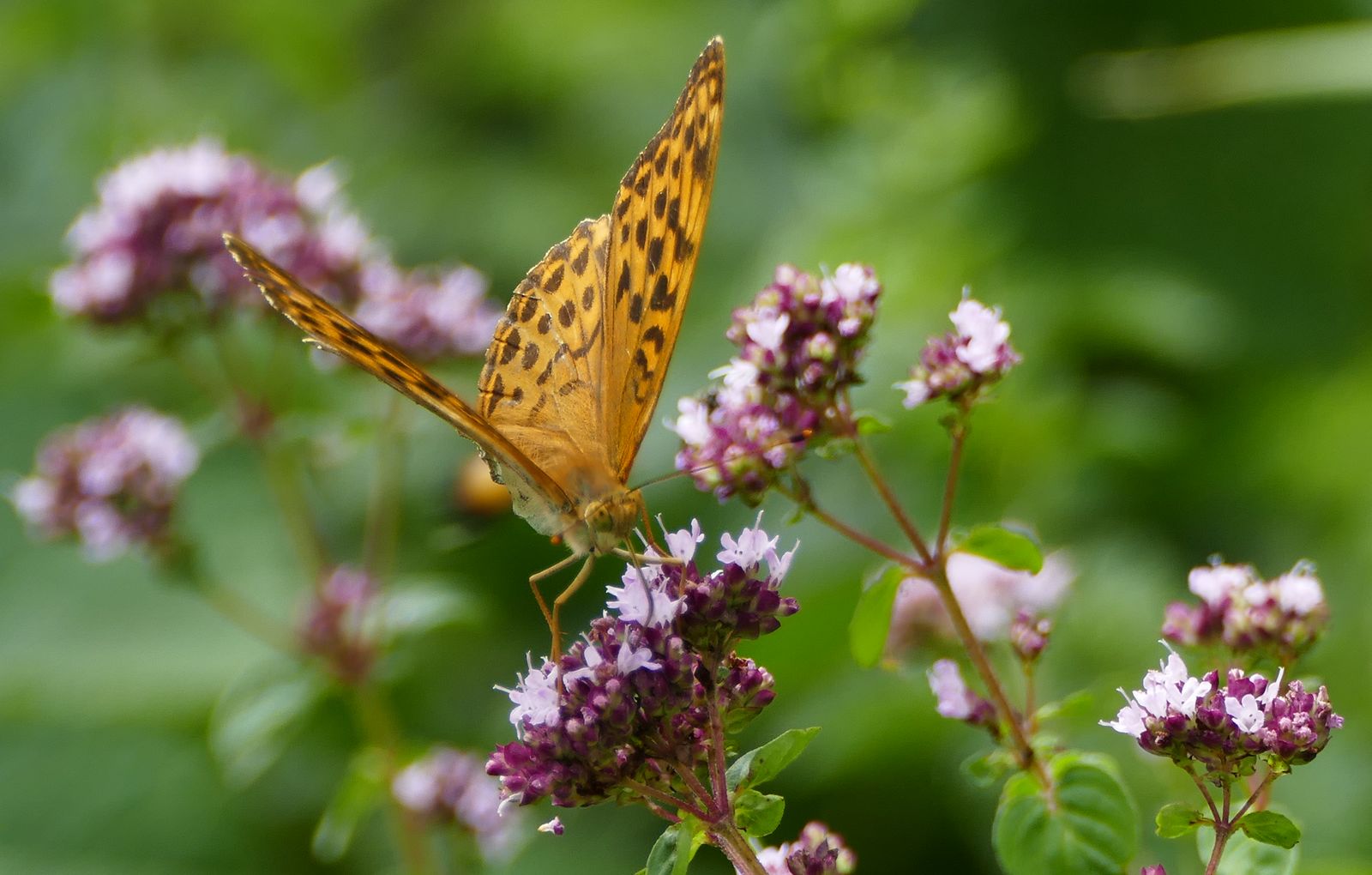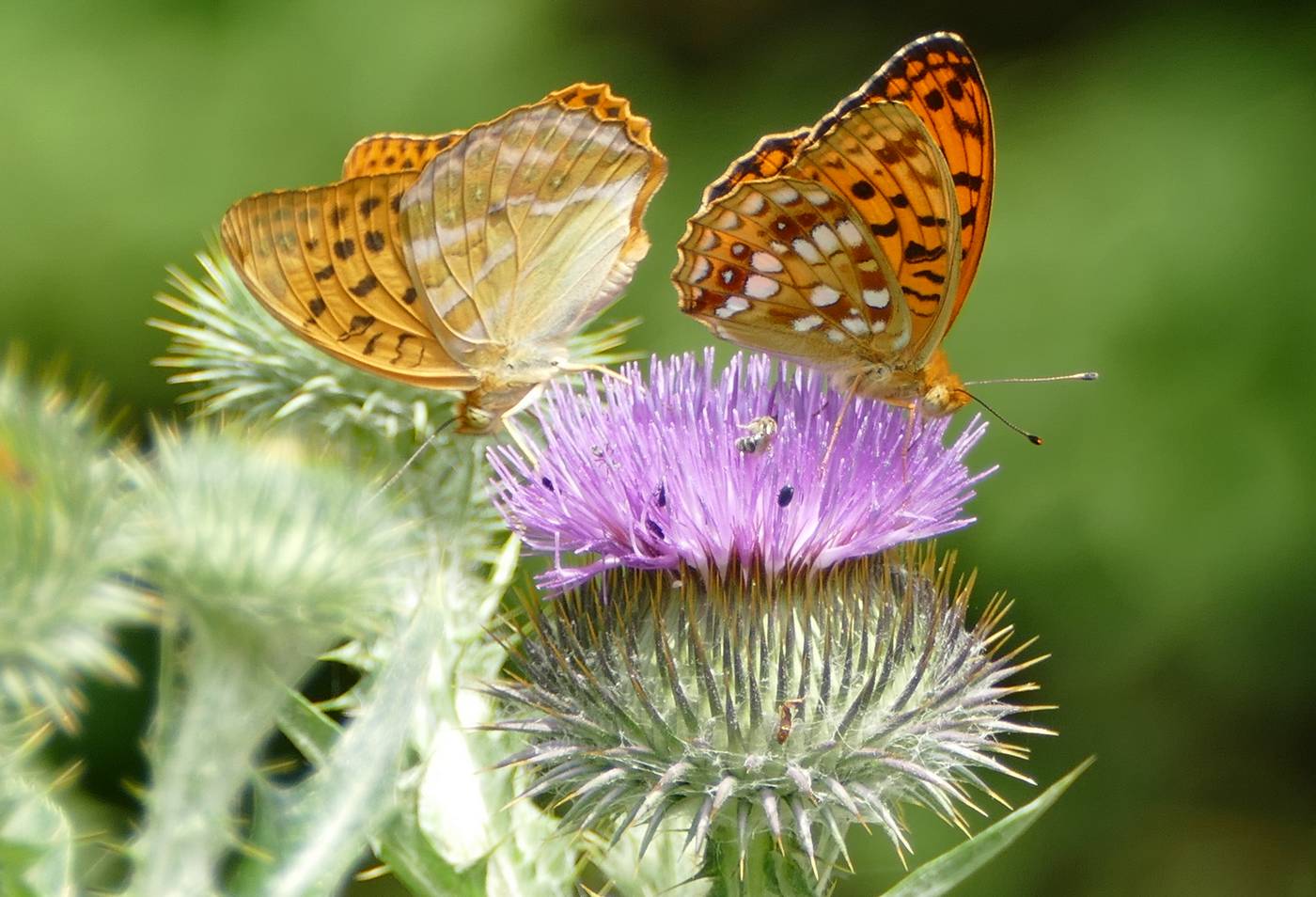 links den Kaisermantel und rechts den Feurigen Perlmuttfalter. Diese beiden Schmetterlinge sehen von oben ähnlich aus, man kann sie aber an der Unterseite der Flügel gut unterscheiden.