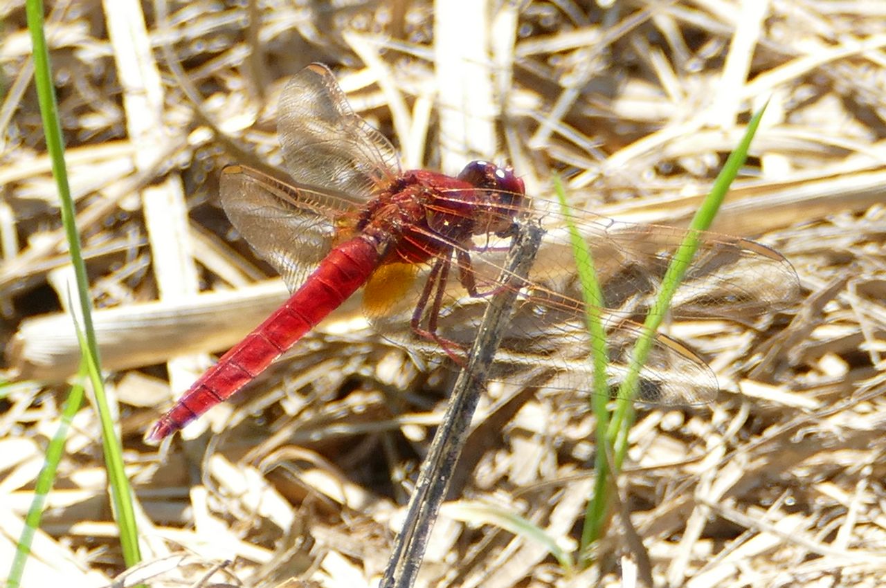 Die beiden Bilder zeigen das Männchen einer jungen blutroten Heidelibelle, das noch nicht ausgefärbt ist.