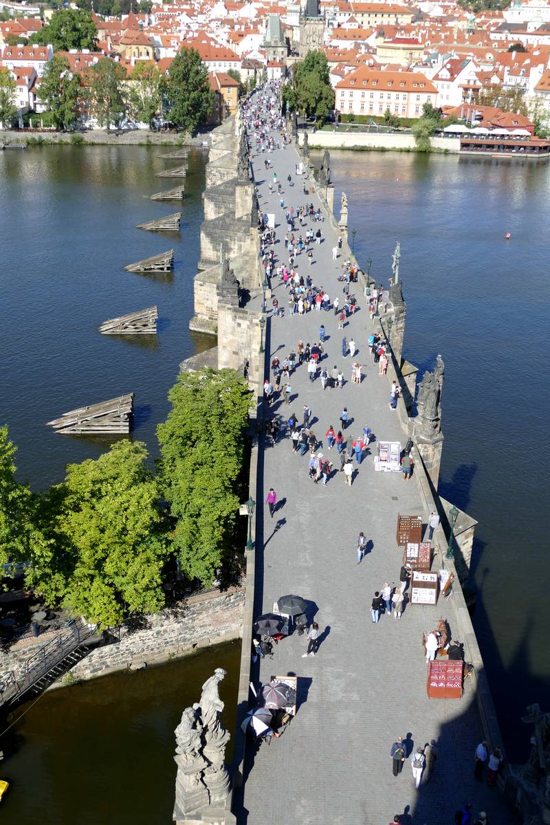 Die Karlsbrücke ist nur am frühen Vormittag so leer. Später ist voll von Touristen, Andenkenstände