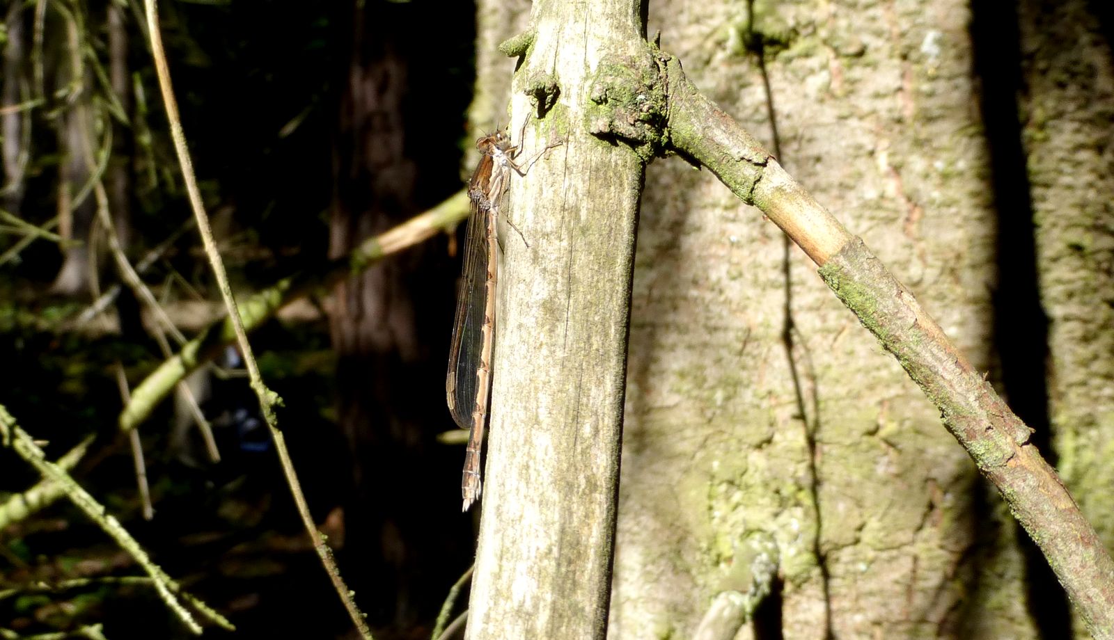 Die farblich gut getarnte Libelle entdeckte meine Frau auf dem jungen Baumstamm.